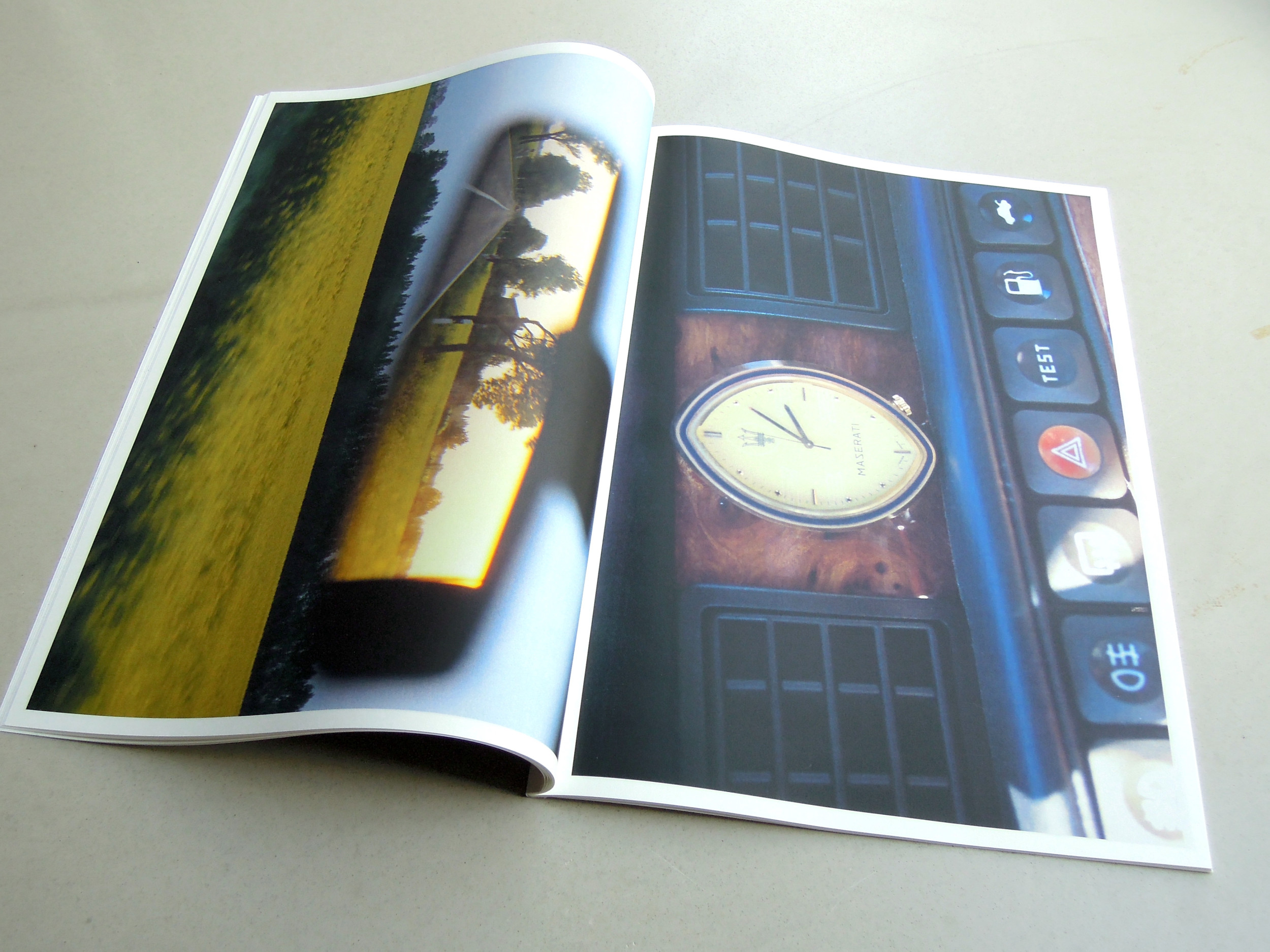 Den etwas zweifelhaften Ruf der Marke wollte ich nicht wahrhaben, da das Ambiente und die Motorisierung mir gepflegtes Reisen ohne Langeweile versprach. In den folgenden Jahren saß ich daher viel am Holzlenkrad und pendelte zwischen meinem Wohnort im Westen, der Hochschullehre im Osten und dem „Areal“ im Süden Deutschlands, wo ich an einem fotografischen Langzeitprojekt arbeitete. Eine automatisierte Kamera hatte ich immer dabei und so entstanden Fotos während der Fahrt, an allen möglichen Aufenthaltsorten, sowie auch überall dort, wo der Maser auf launische Art unfreiwillige Stopps erzwang.“ J.B. (Text-Ausschnitt aus MASER)