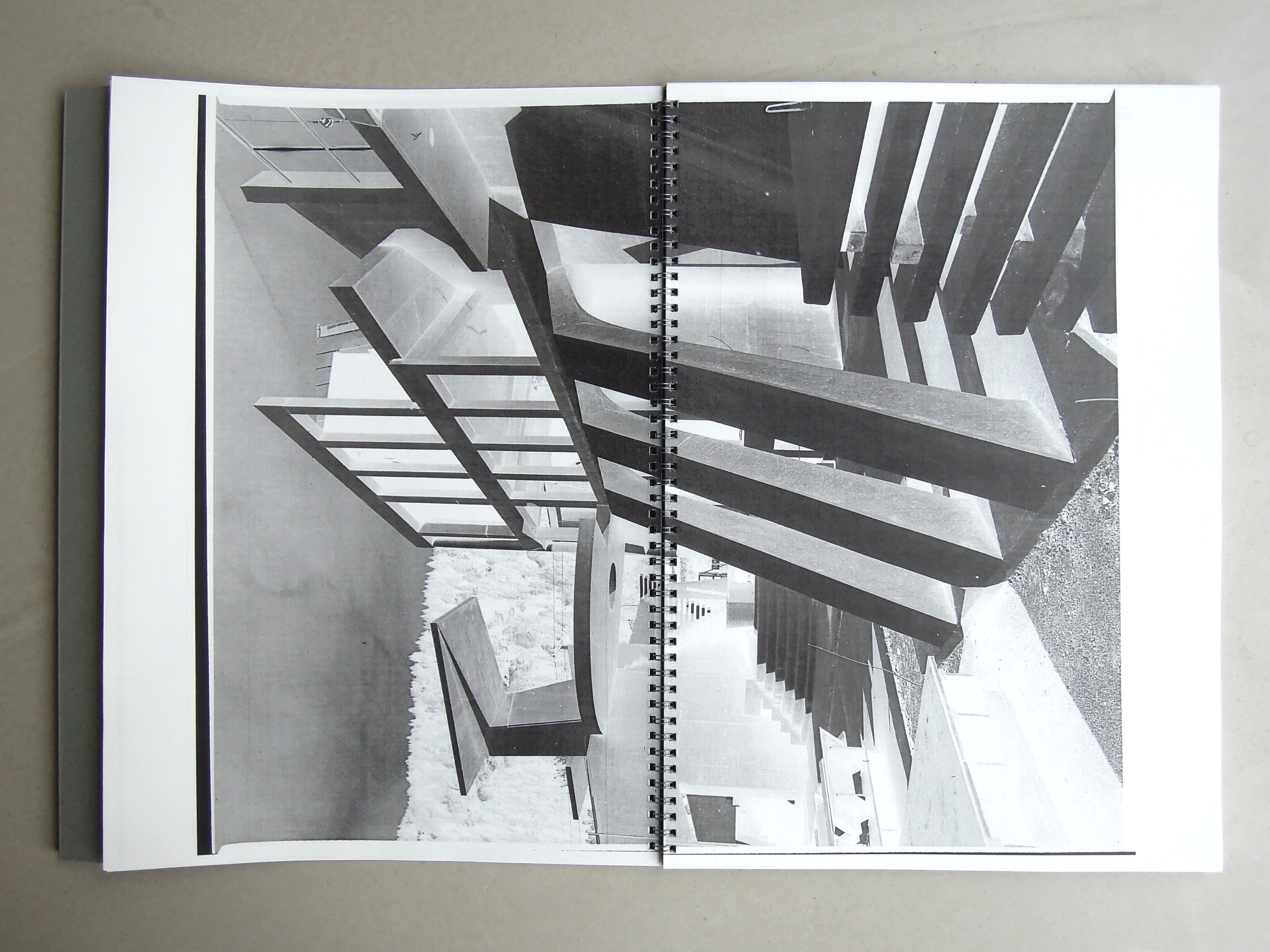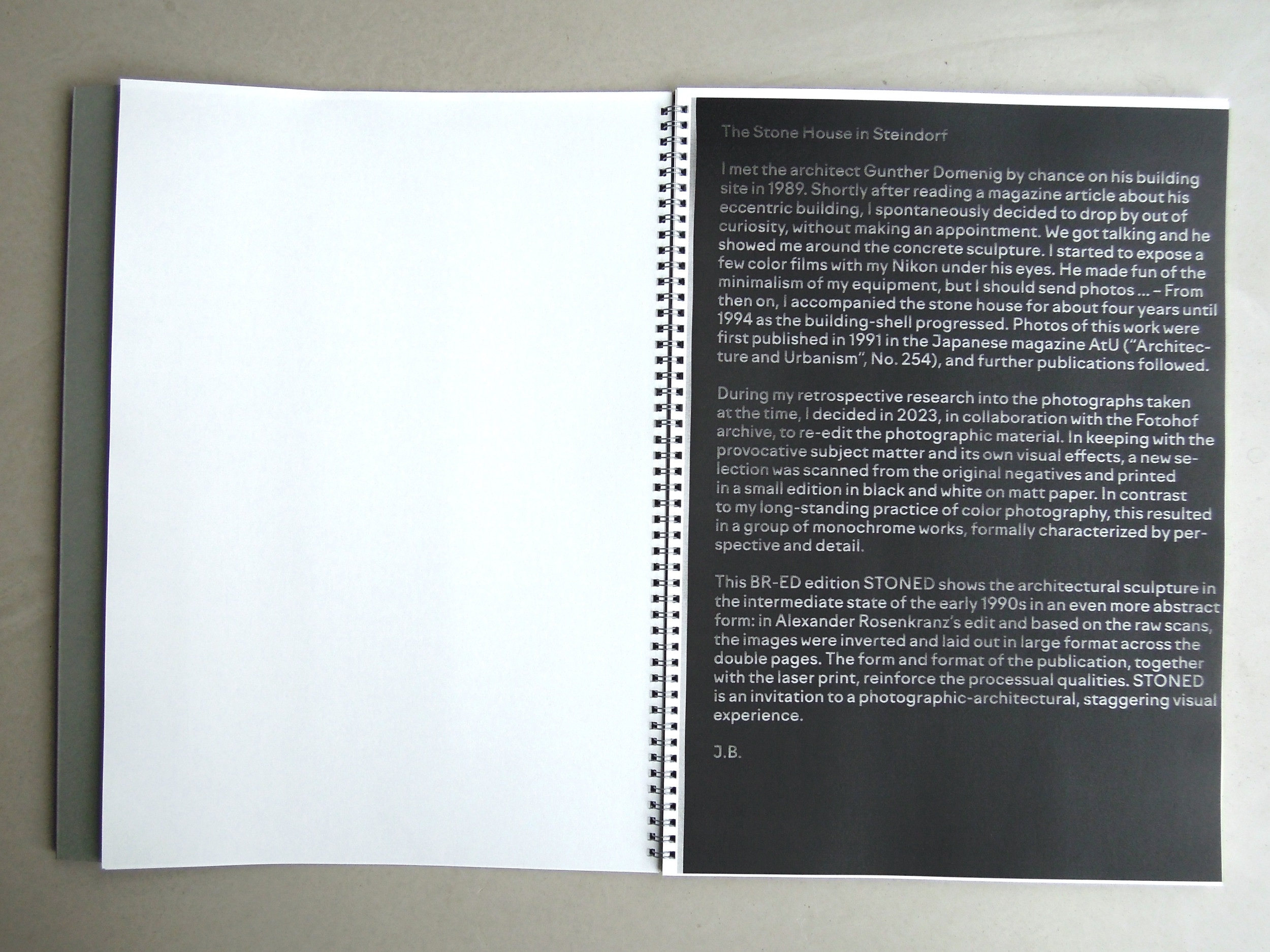 This BR-ED edition STONED shows the architectural sculpture in the intermediate state of the early 1990s decidedly abstract: in Alexander Rosenkranz's edit and based on the raw scans, the images were inverted and laid out in large format across the double pages. The form and format of the publication, together with the laser print, reinforce the processual qualities. STONED is an invitation to a photographic-architectural, staggering visual experience.